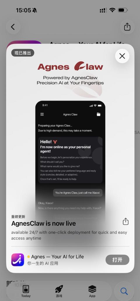 在OpenClaw热度持续上升之际,Agnes将「Claw」接入自家App,实现AgnesClaw一键部署。