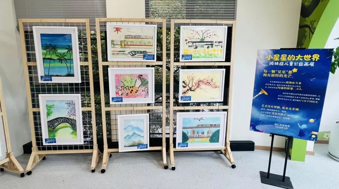 正值第十九个世界孤独症日来临之际,现场设置“小星星的大世界”公益画展,展出孤独症儿童的斑斓作品,展现他们丰富的内心世界。
