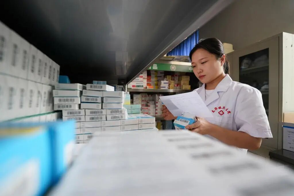 某镇卫生院药房工作人员为患者取药。资料图:新华社