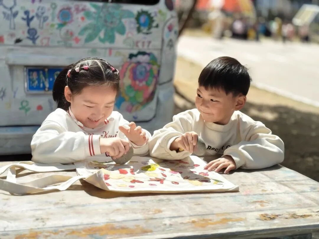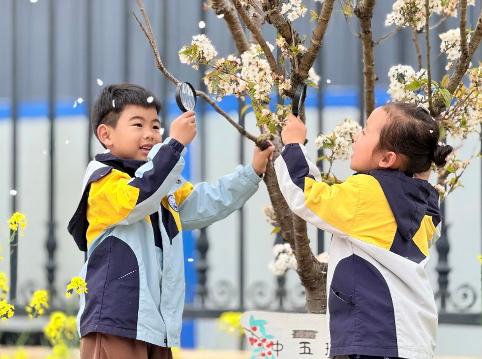 下骆宅幼儿园的孩子们高举放大镜,踮脚凑近花枝,认真观察花瓣纹理与花蕊姿态,眼里满是对自然的好奇与热爱。