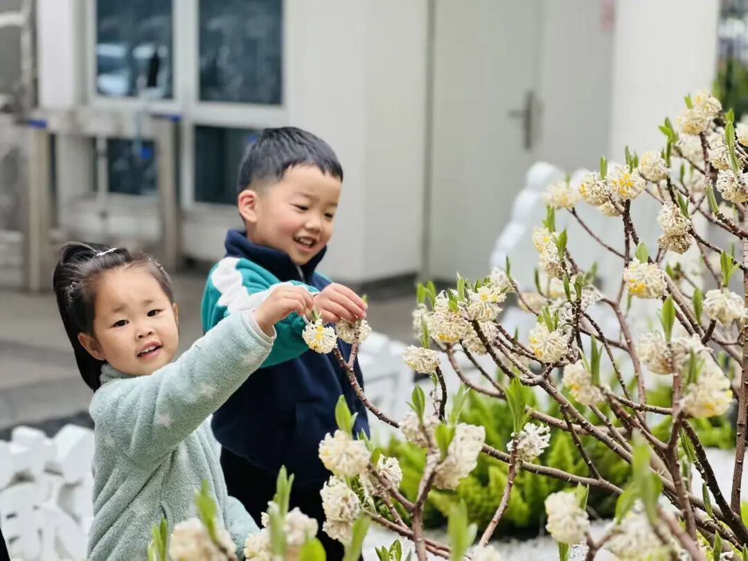 河畔幼教集团稚趣岛园区的学生们化身小小自然探索家,凑近洁白的结香花,细嗅春日的芬芳,感受生命的律动。