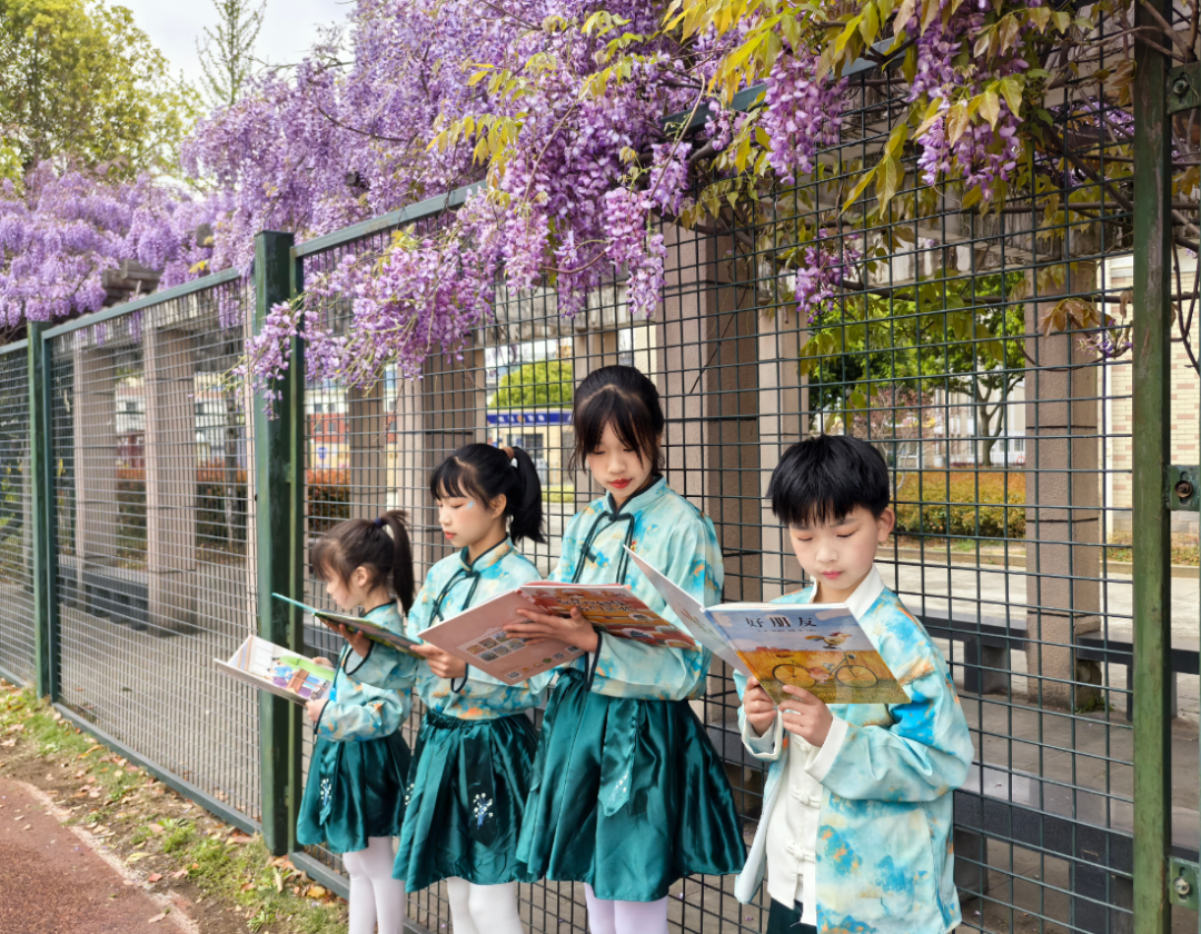 紫藤如瀑,一串串垂下,像极了“紫葡萄”。孩子们静立花下,书香与花香交织,为校园添了一抹静谧优雅。