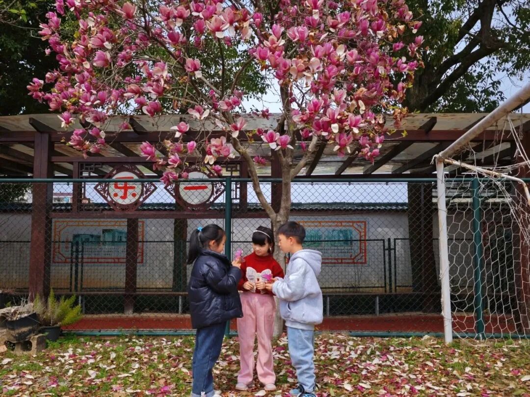 毛店小学的操场上,玉兰树开得繁盛,孩子们驻足花下,三五成群地聊着天。
