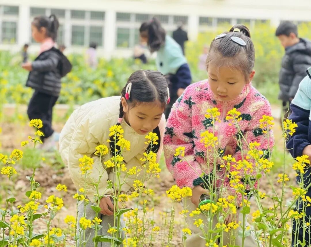实验小学附属幼儿园的小朋友们走进实验小学寻找春天,春天藏在油菜花与嗡嗡的蜜蜂中,也藏在含苞待放的花骨朵里。