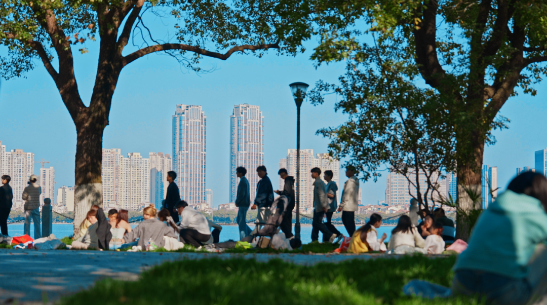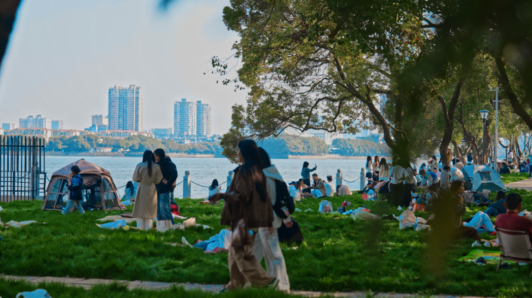 大片草坪铺着新绿,香樟林郁郁葱葱。找一处长椅静坐,或铺块野餐垫小憩,看湖面波光粼粼,听春风轻语,不用刻意打卡,发呆就是最好的旅行。