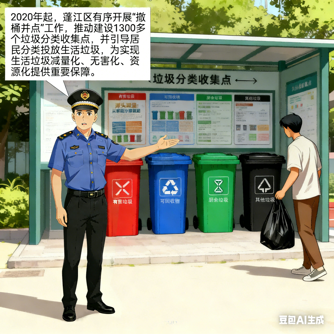 ▲蓬江区开展撤桶并点及建设分类收集点,引导居民分类投放