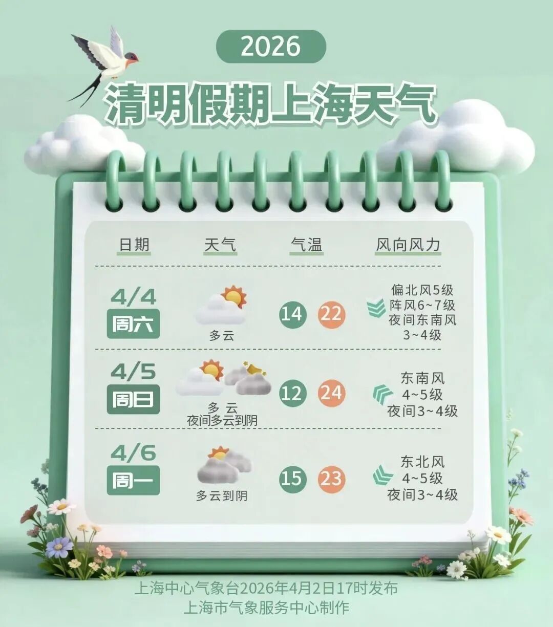 清明节期间(4日至6日),上海以多云天气为主,气温整体在12到24℃之间,体感温暖舒适。假期结束后,本市主要降雨时段为下周中期,其中周四降水较为明显;下周初和周末则以多云或阴天为主。气温变化平稳,基本维持在13到20℃之间。