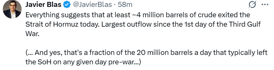 据资深中东记者Javier Blas在社交媒体披露,今日霍尔木兹海峡的原油流出量至少达400万桶,创下伊朗战争爆发以来该海峡单日流量的最高纪录。