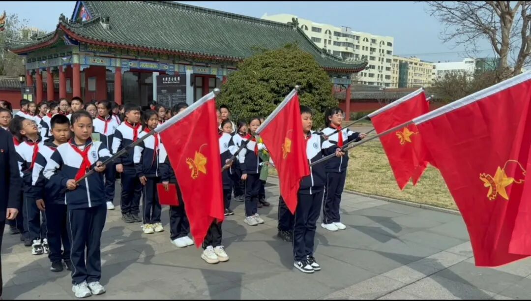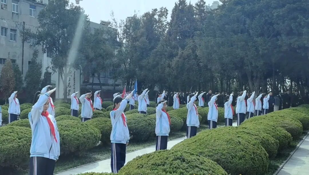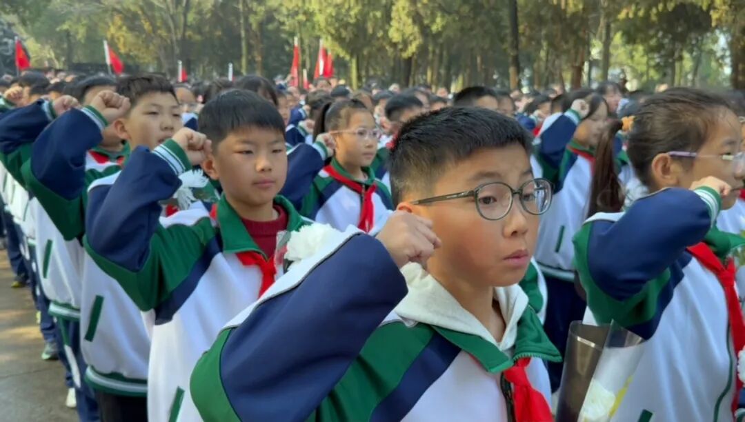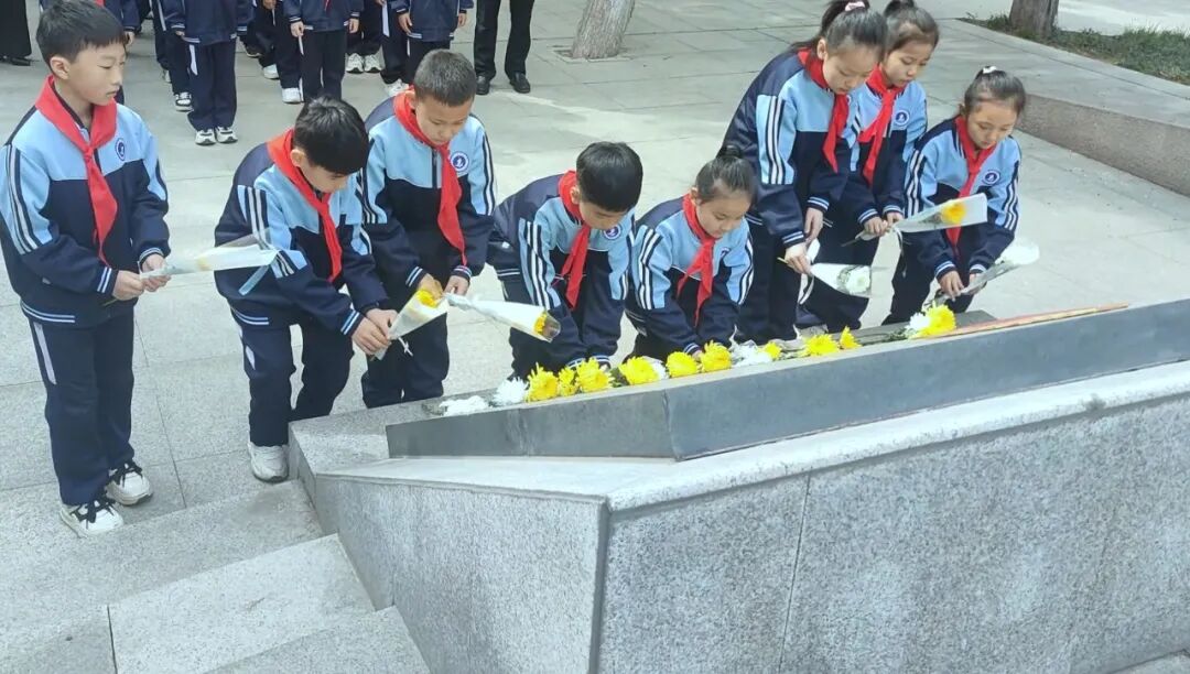 孩子们身着整洁的校服,胸前佩戴着鲜艳的红领巾,列队肃立,脸上满是崇敬之情。