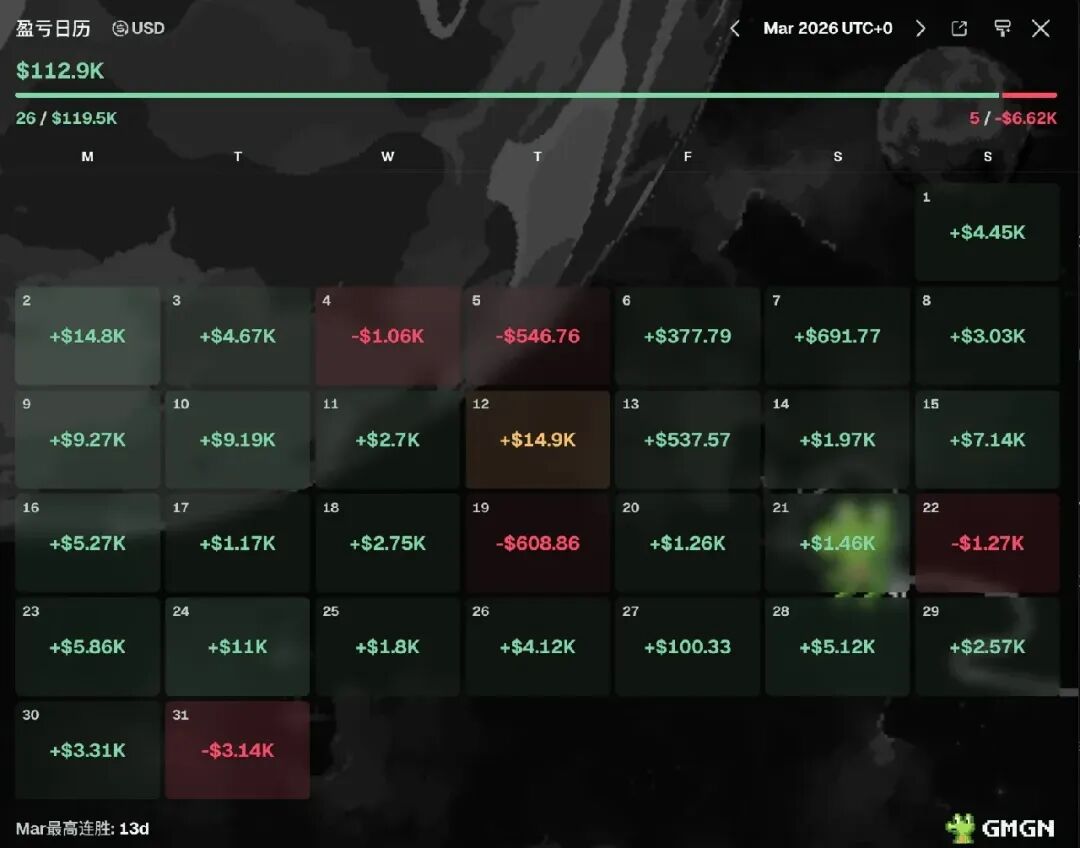 入圈一年,Jerry已是BSC上小有名气的Meme玩家。据GMGN数据,他(ID:金狗吊车)在30日牛人榜排第12位,3月累计赚11.29万美元,仅5天亏损,最高连胜13天,单天最高盈利1.49万美元。