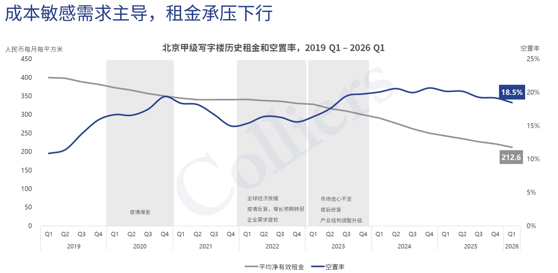 租金方面,整体市场平均净有效租金为212.6元/月/平方米,环比下跌4.2%,同比跌幅扩大至12.4%,“量稳价跌”特征明显。