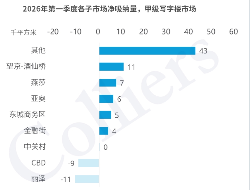 今年一季度,北京甲级写字楼市场中CBD和丽泽区域承压最显著。CBD子市场净吸纳量仍为负,延续三年来空置面积增加的态势;丽泽子市场本季度首次出现净吸纳量负值,这是其过去五年大规模去化后的良性调整。