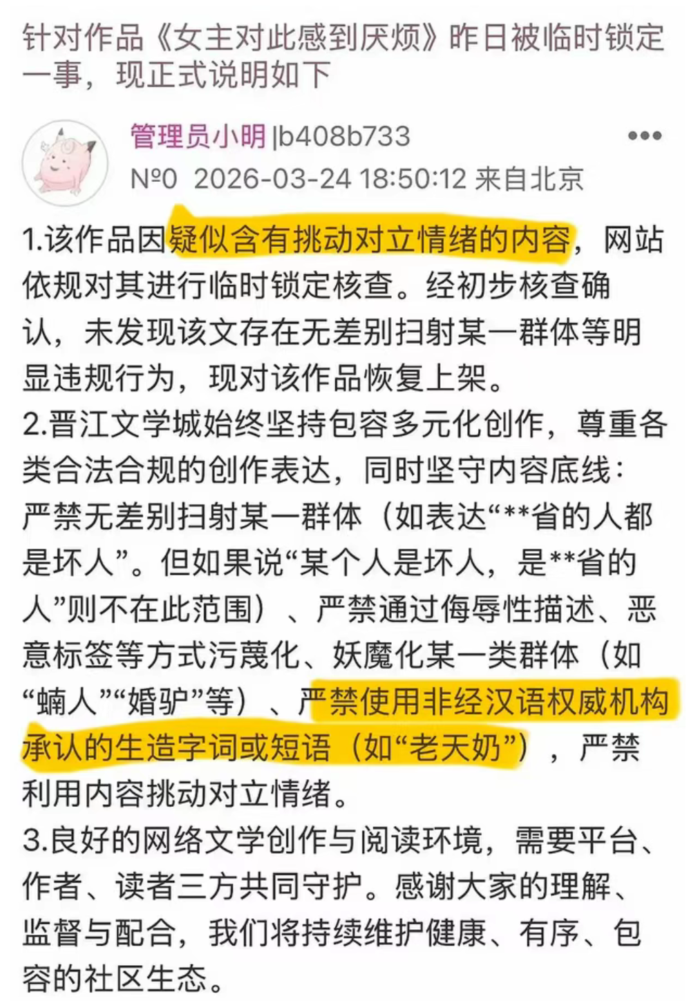 “老天奶”遭晋江封禁引争议,语言规范与创作自由如何平衡?