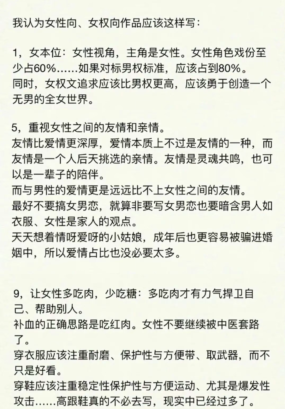 网络上流传的《爱女写作纲要》,对女性向作品的创作细节做出了明确规定。
