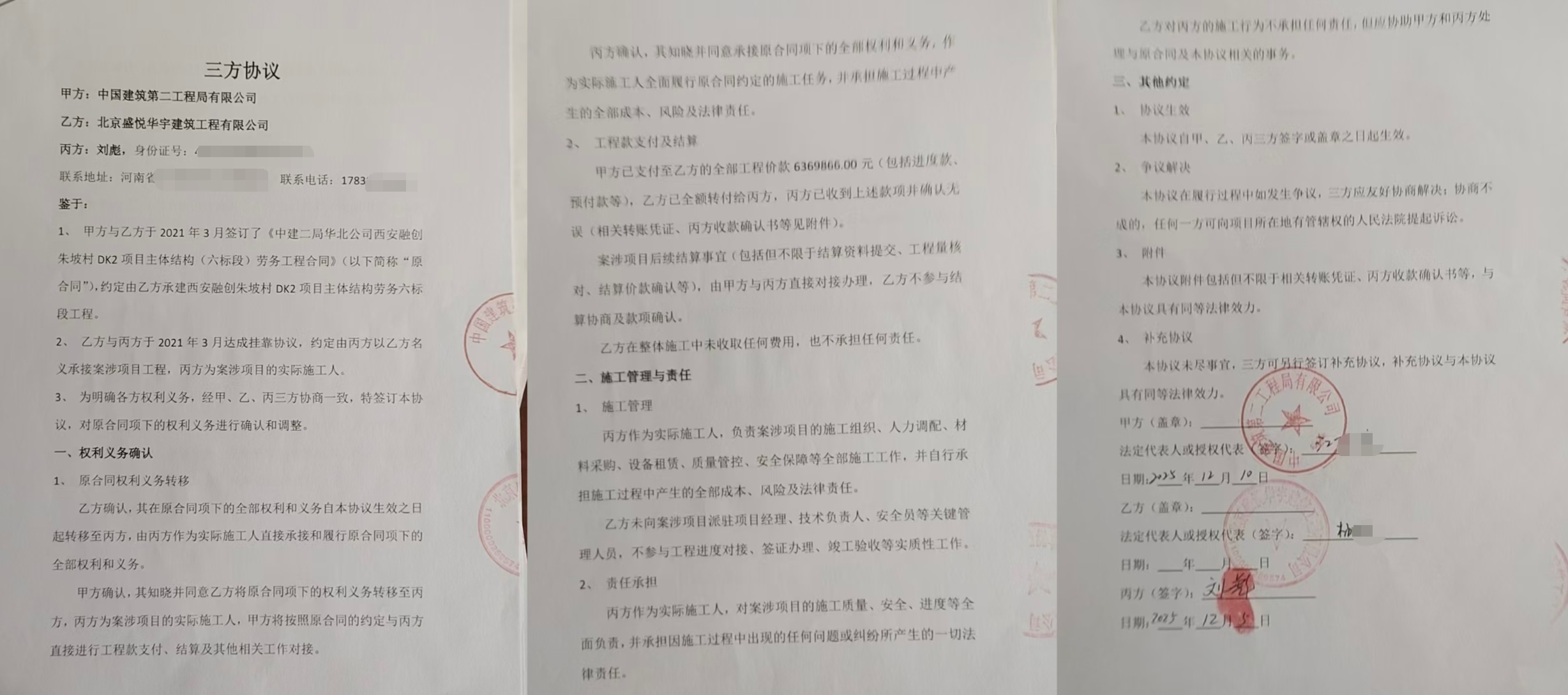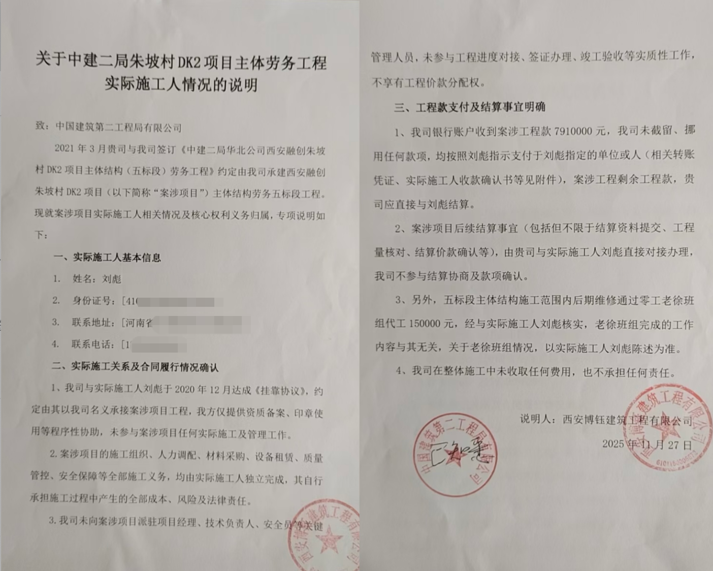 刘彪称,2020年12月、2021年3月,在中建二局华北公司领导推荐下,先后与西安博钰建筑工程有限公司、北京盛悦华宇建筑工程有限公司口头达成“挂靠协议”并支付管理费。两家公司随后与中建二局签订劳务合同,约定刘彪负责朱坡村DK2项目主体五、六标段施工。