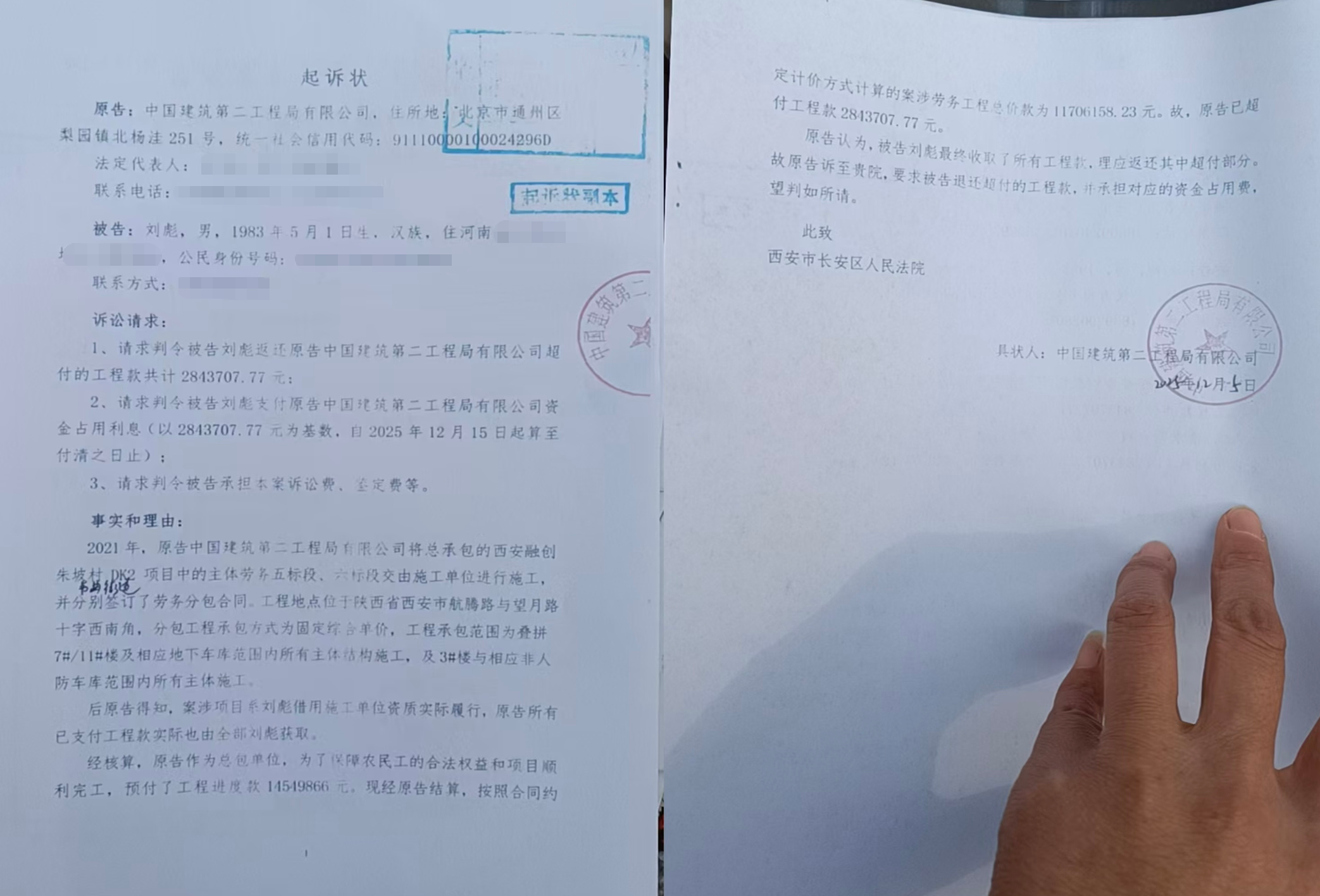 然而,2026年3月23日,刘彪收到西安法院传票,中建二局起诉他,要求返还超付的280万元工程款及利息。