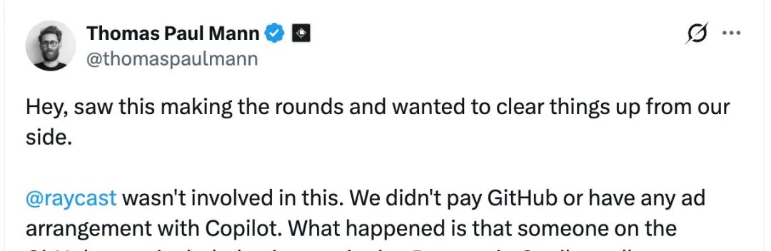 这得从去年说起。GitHub被微软收购后,去年8月与Raycast合作推出官方集成,用户可在启动器中管理Copilot代码任务。所以Raycast出现在广告里并非随机,相当于微软官方合作伙伴的广告被Copilot强行插入第三方代码库。
