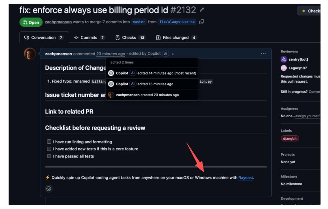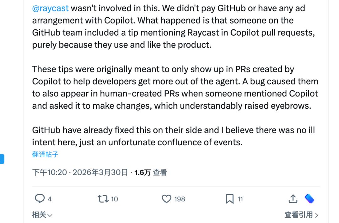 事情经过是这样的:GitHub团队某位成员在Copilot创建的PR中加入对Raycast的提及,只因他们使用并喜欢这款产品。这些提及最初只出现在Copilot创建的PR上,本是为开发者提供帮助。但因一个bug,当有人@Copilot请求修改时,这些内容(也就是这次的广告)会出现在人工创建的PR中。GitHub已修复该问题,这并非恶意,只是一系列不幸事件的巧合。