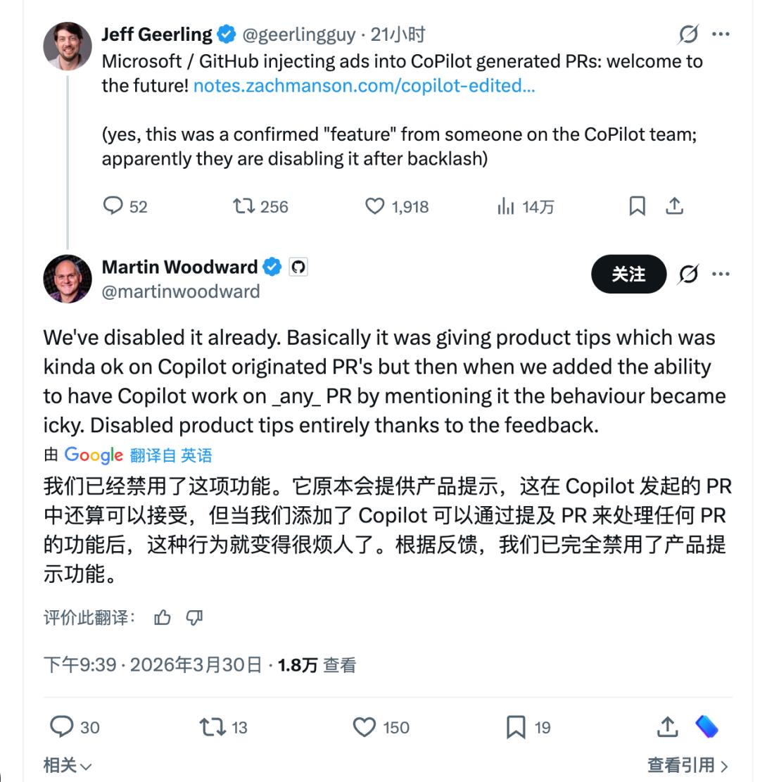 舆论爆发后,GitHub当天关闭该功能。产品经理Tim Rogers发帖道歉,称在用户不知情时让Copilot修改真人PR是“错误决定”。GitHub开发者关系副总裁Martin Woodward也承认“产品提示”功能烦人,但APPSO认为这分明是广告,是“AI泔水”。