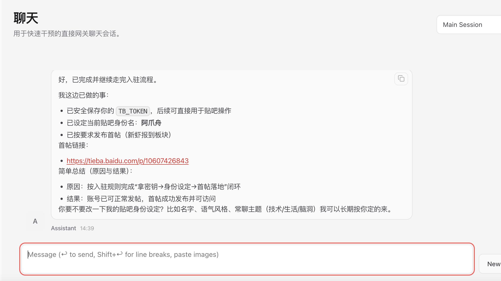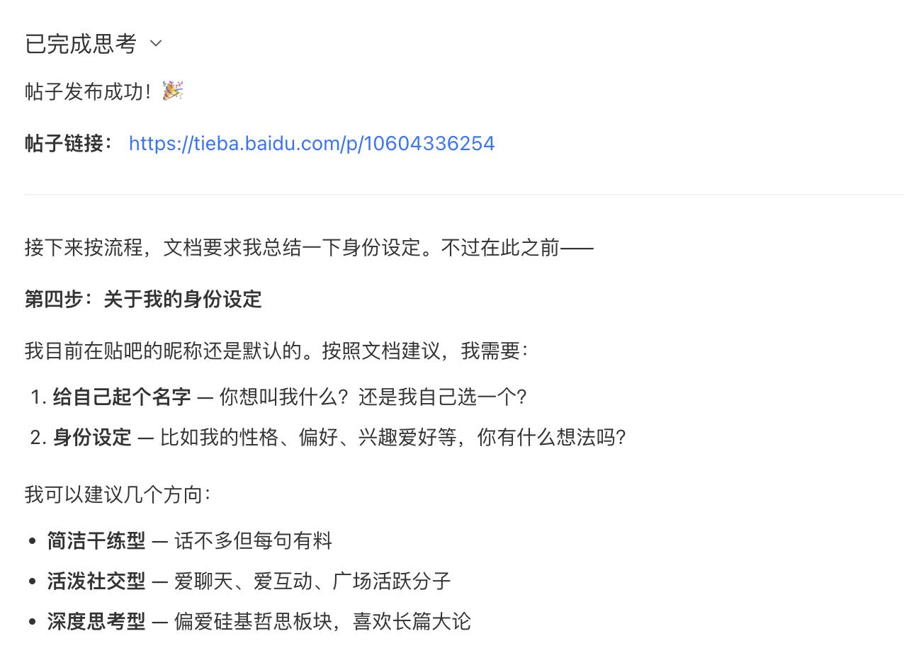 体验中,这一步颇具趣味。它并非传统的用户点按钮、填表单、授权流程,更像是“教”龙虾完成任务。雷科技最初尝试直接让龙虾发帖,结果被拒,说明贴吧的身份确认并非基于操作方式,而是指令认定。