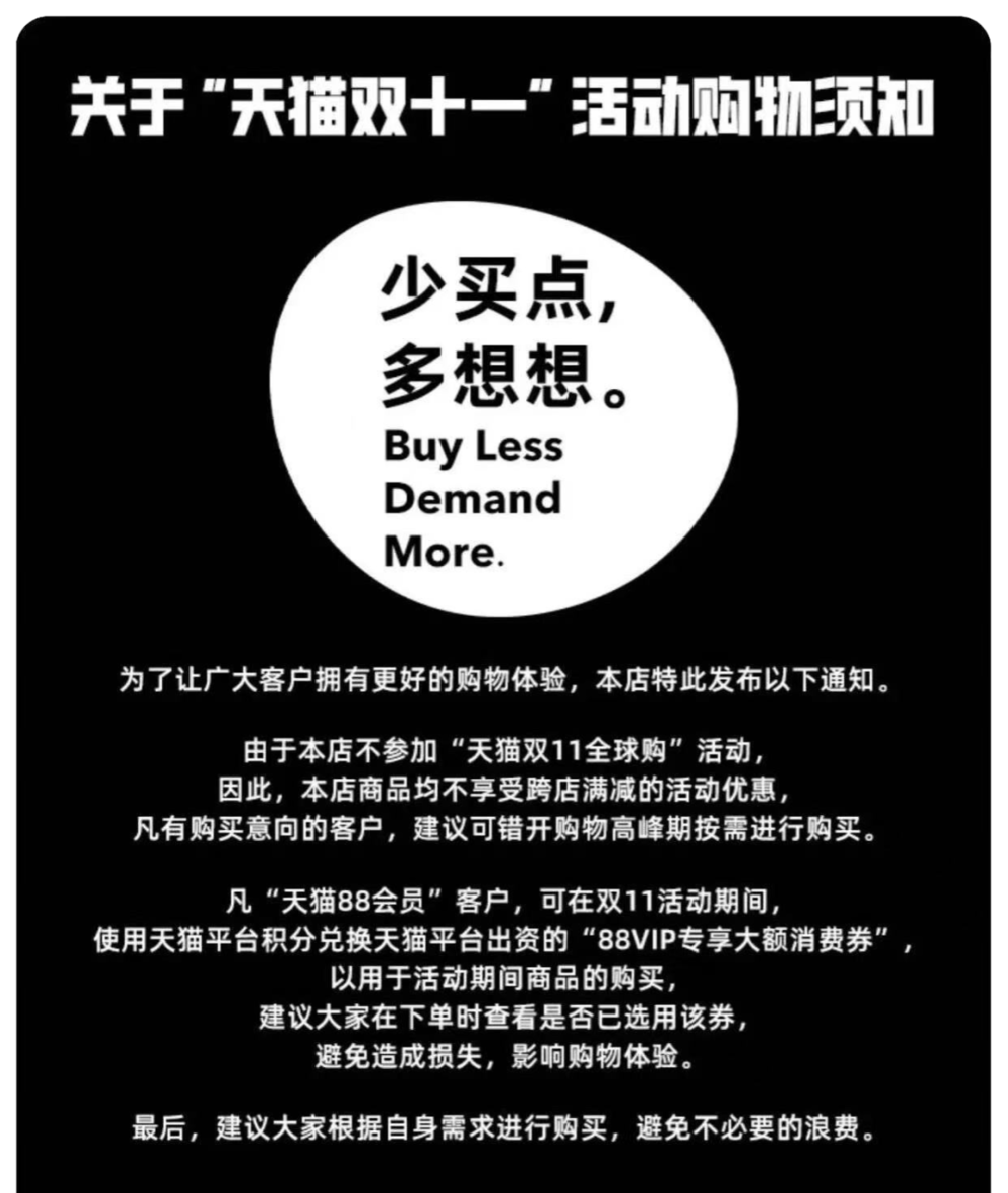 去年,Patagonia曾发布公告明确表示不参与“天猫双十一全球购”跨店满减活动,提醒消费者错峰购买,并强调按需下单。