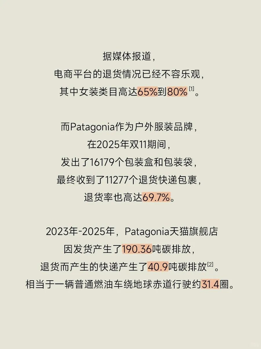 尽管如此,最新数据显示,Patagonia在2025年双十一期间的退货率仍高达69.7%。2023年至2025年,其天猫旗舰店出货产生190.36吨碳排放,退货环节又产生40.9吨碳排放。