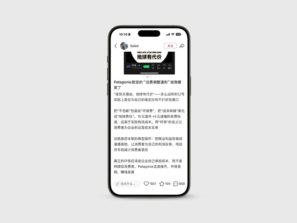 然而,多数中国消费者对此并不认可。小红书用户@Salad指出,Patagonia此举是将“不包邮”包装成“环保费”,把成本转嫁美化成“地球责任”,以环保名义让消费者承担企业运营成本。同时,退换货收取的费用高于实际成本,商家有牟利之嫌。