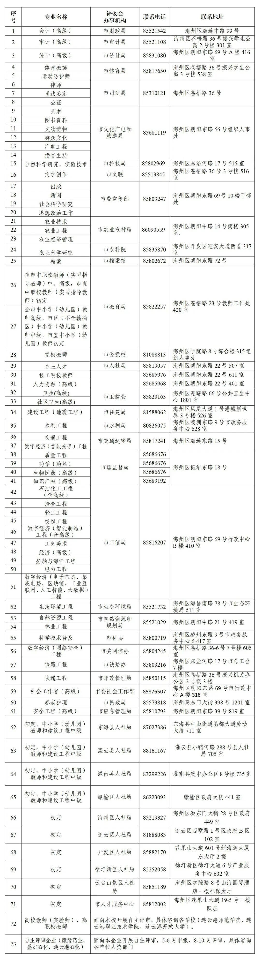 中级:石油化工工程、体育教练、运动防护师、农业技术、农业工程、农业经济管理、档案、建设工程(地震工程)、工艺美术、数字经济(电子信息、集成电路、区块链、工业互联网、人工智能、大数据)工程、养老护理、东海县中小学(幼儿园)教师、灌南县中小学(幼儿园)教师、赣榆区中小学(幼儿园)教师