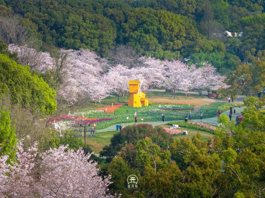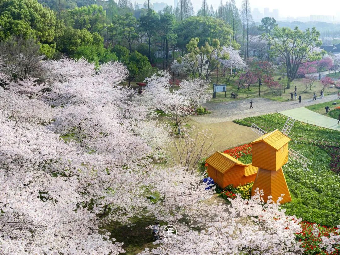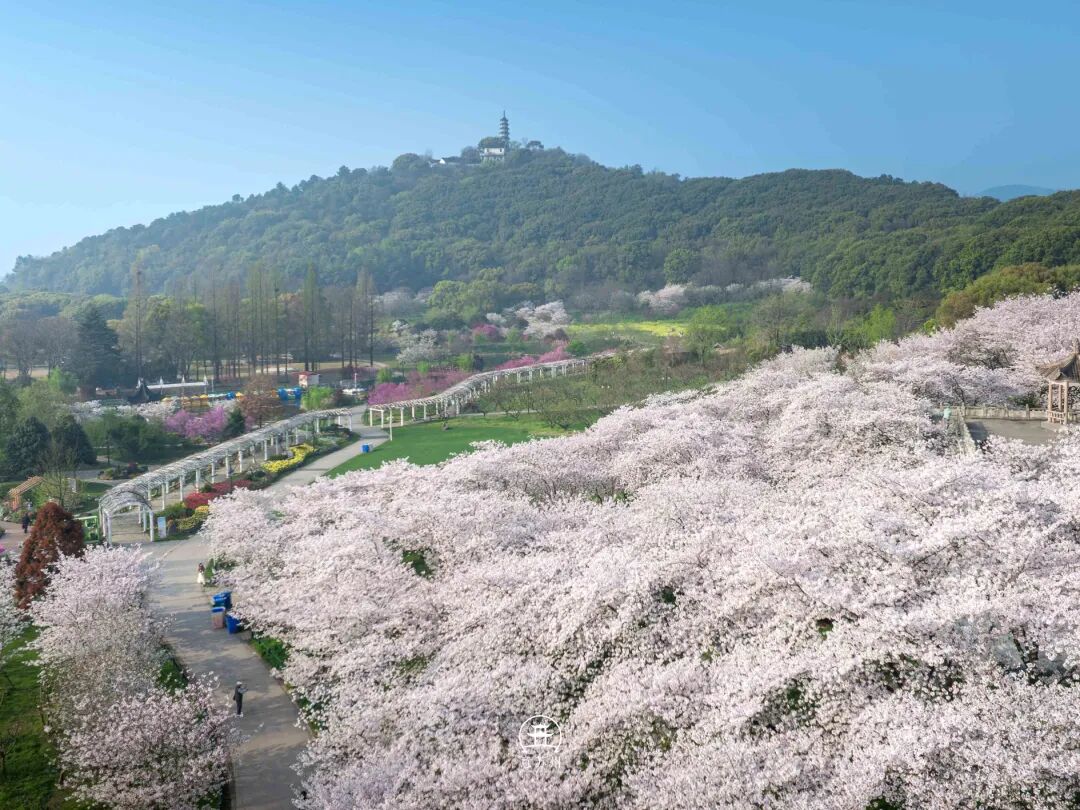 当镜头自云端缓缓垂落,上方山国家森林公园的春日盛景便以磅礴之势铺展。漫山樱花如雪似云,沿山势层层晕染,与谷底郁金香花海、山间古寺飞檐、远处城市天际线交织,绘就江南春日绝美长卷。
