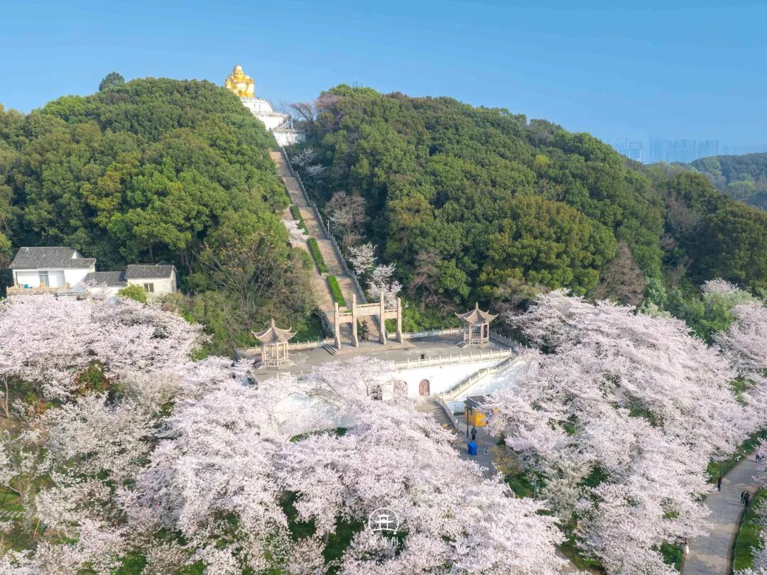 镜头抬升,江南园林巧思与山水壮阔尽显。古寺飞檐、金色造像、山间亭台在樱花掩映下若隐若现,人文与自然完美交融。远处山林层峦叠翠,与近处繁花、脚下流水构成立体春日盛景,每一次俯瞰都有不同惊艳。