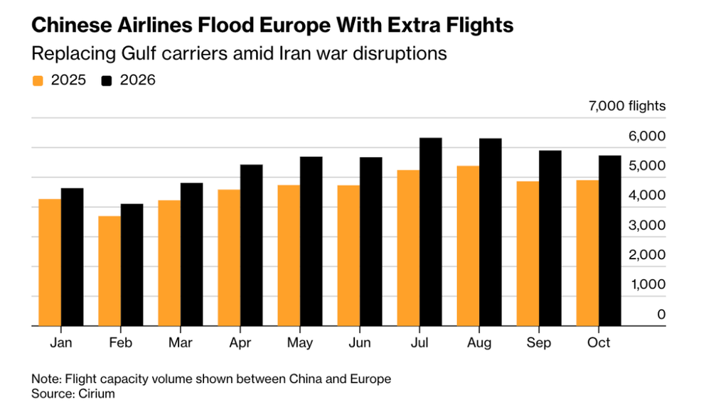 Cirium数据显示,今年夏季中国飞往欧洲的航班数量同比增长约20%,成为亚欧长途航线的核心承接力量。