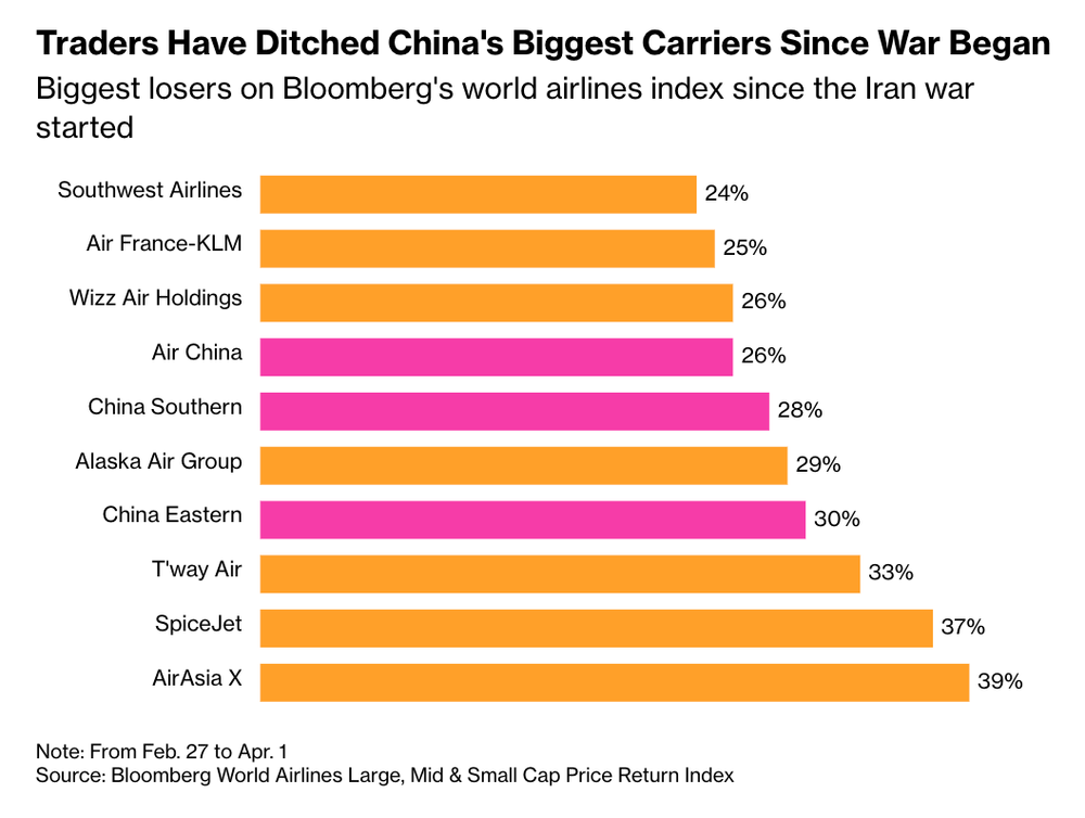 自2月28日冲突爆发以来,国航、东航、南航三大国有航司在港股市场的跌幅均超过26%,进入彭博全球航空股价格回报指数中跌幅靠前的行列,与市场预期形成了鲜明反差。