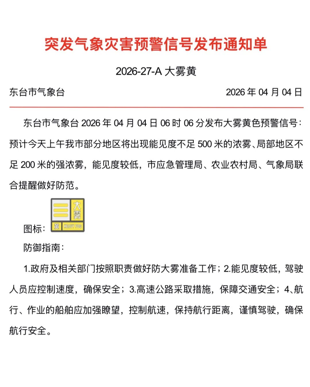 东台市气象台于2026年04月04日06时06分发布大雾黄色预警信号。根据预报,今天上午我市部分区域可能出现能见度低于500米的浓雾,局部地区甚至会出现能见度不足200米的强浓雾。由于能见度较低,市应急管理局、农业农村局与气象局已联合发出提醒,呼吁市民做好相关防范工作。