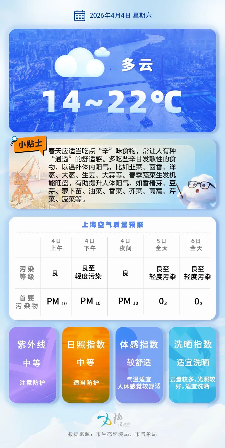 上海以多云天气为主,气清景明,