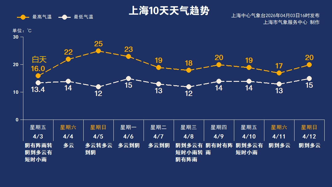 5日清明节当天,上海以多云天气为主,最高气温有望升至25℃。假期里申城体感舒适,适合祭扫、出游和洗晒。天气干燥,需注意用火用电安全,户外活动时要做好防晒补水。下周二天气依然较好,周三起云量增多,申城多阵雨或短时小雨。气温方面,假期结束后略有回落,在12~20℃之间波动。