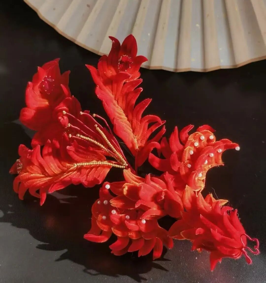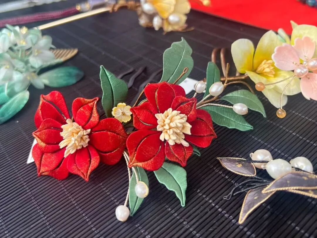 纤手捻动彩丝,匠心铸就芳华。一支成品绒花发簪,需要耗费数小时,从拗形、绕丝到攒枝、组合,无数道细碎的工序凝聚着手工的温度。“我习惯在家做好基础工序,到店里再慢慢组装花瓣,一个系列只做五六支,每一款都是独一无二的。”褚晓静指尖抚过花瓣,语气温柔而坚定。
