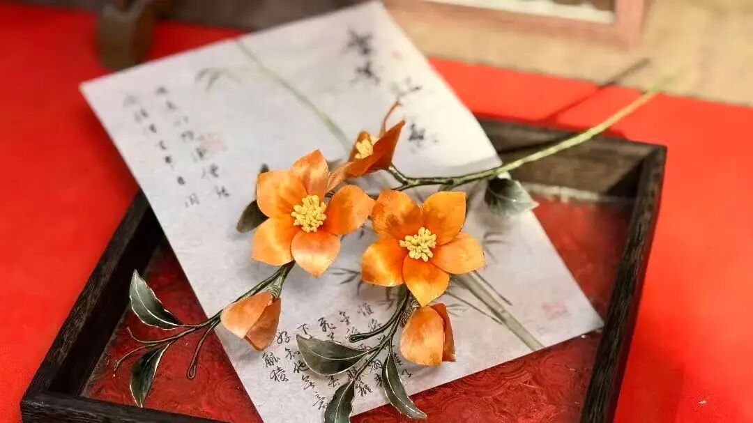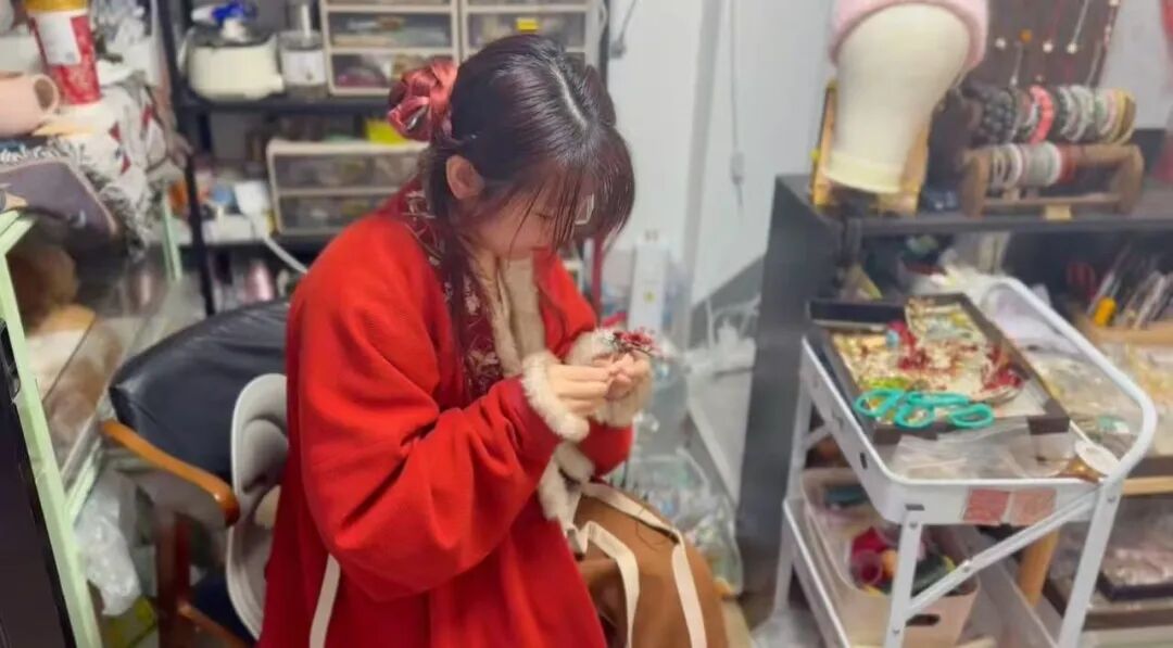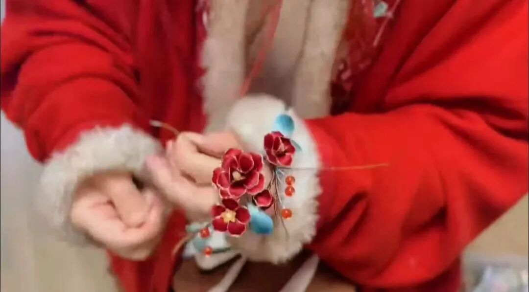 小小的店铺内,主理人褚晓静身着红衣、头戴素簪,端坐案前,细如发丝的蚕丝在她指尖缠绕,铜丝被轻轻拗成花瓣形状,一支精致的绒花发簪渐渐显现出雏形……