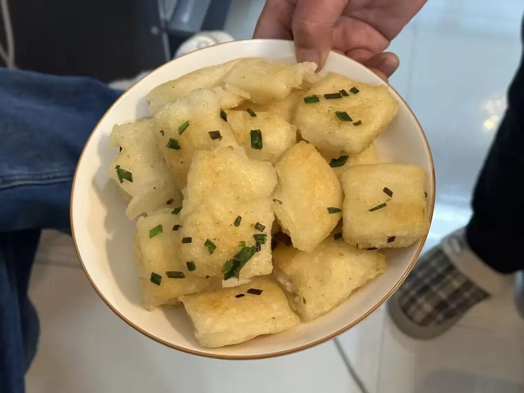 这时候可千万别扔!萧山人有专属吃法:平底锅烧热淋少许菜油,把切好的年糕片铺进去,出锅撒点盐花或什么都不撒。