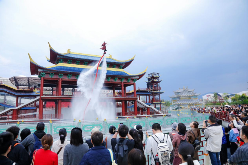 4月1日,四川首个沉浸式演艺标杆项目“梦回青城·演艺园区”在都江堰开业。该项目由融创文旅打造,以“文化+演艺+游乐”模式填补了四川复合型业态空白。园区以《梦回青城》和《马超镇守都江堰》两大实景演艺为核心,搭配四大主题巡游,日均超100场互动演出,还有大型游乐设备。主秀《梦回青城》首演座无虚席,2万㎡实景剧场融合国风建筑、水景、升降舞台等,通过裸眼3D、激光喷泉等特效演绎巴蜀文化。开业期间,每晚有无人机光影秀、孔明灯放飞,百位“白娘子”互动,还推出“一票玩三天”政策。