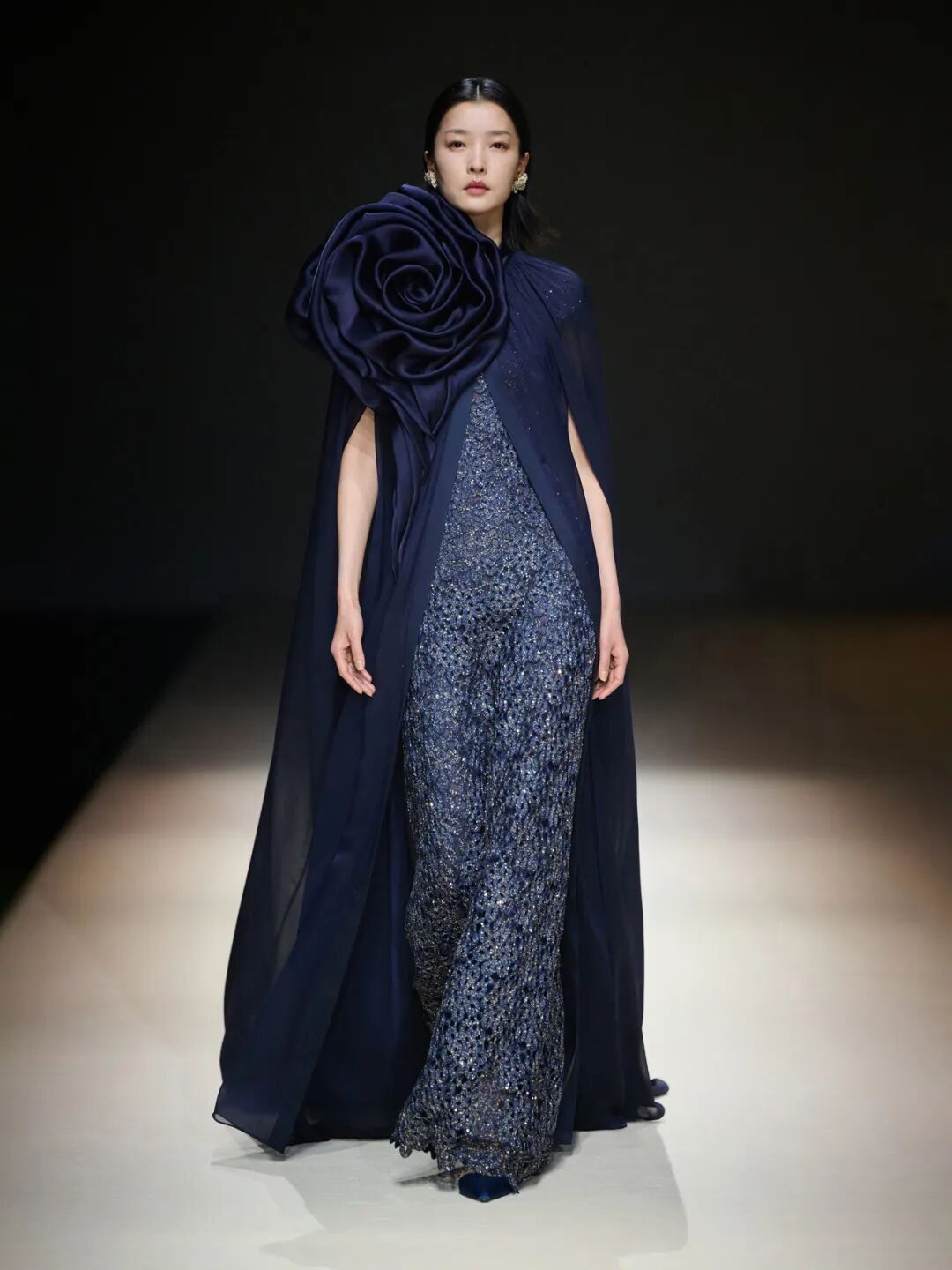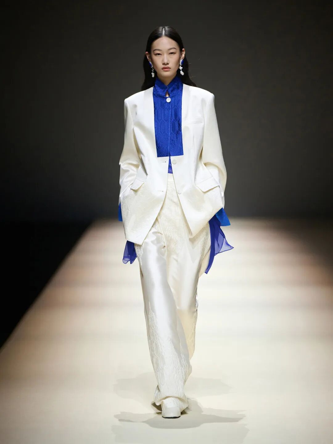 3月31日晚,上海新天地秀场灯光璀璨。蜿蜒的秀道如曲水流觞,将东方美学与当代潮流串联起来。音乐家李晓川带领上海音乐学院乐团现场演奏,东方民乐与西方交响乐相互交融,和谐自然。秀场以“凤穿牡丹”和贞丰苗族纹样为核心灵感,把东方意蕴融入现代设计;“雅莹蓝”贯穿全场,既有哲思又不失鲜活;立领、交襟领、斜襟等中式款式搭配精湛工艺,既显利落现代,又传递出中国式优雅。
