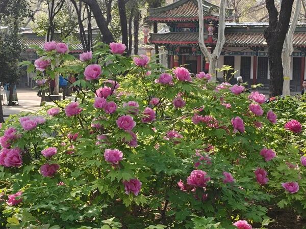 王城公园:全园约280个牡丹品种开放,主要集中在沉香楼、牡丹仙子、九色台、傲梅渲春等地。盛开品种有醉西施、二乔、荷花绿、蓝宝石、姚黄等;初开品种包括富贵满堂、胜葛巾、锦袍红、似荷莲、迎日红、泼墨秀等。园内棣棠、樱花、碧桃、垂丝海棠也竞相开放。