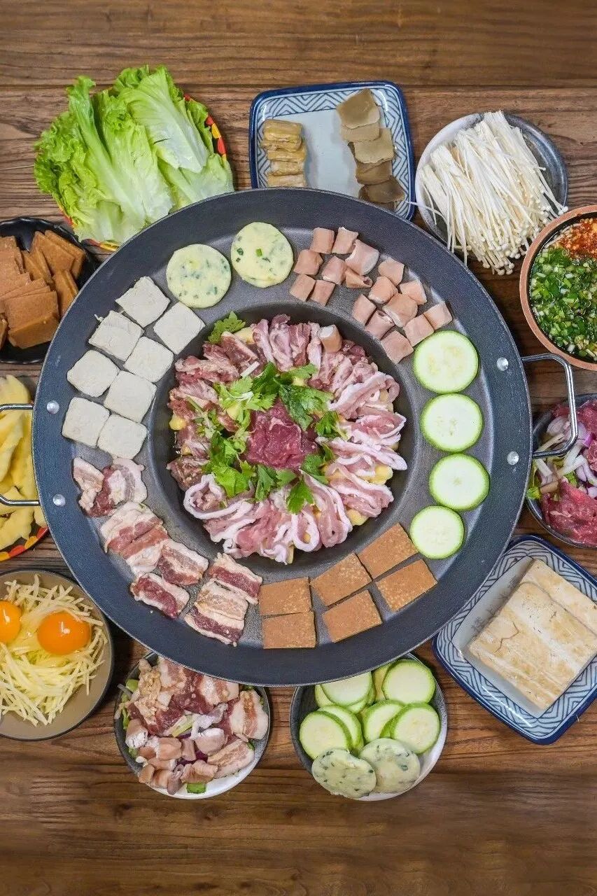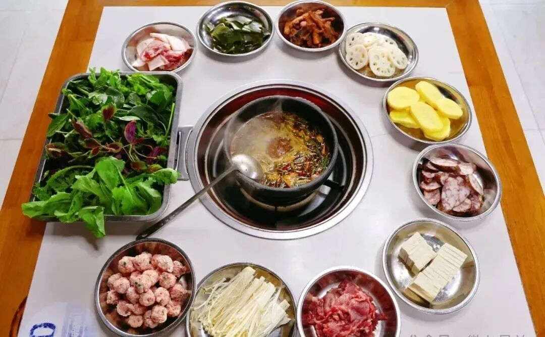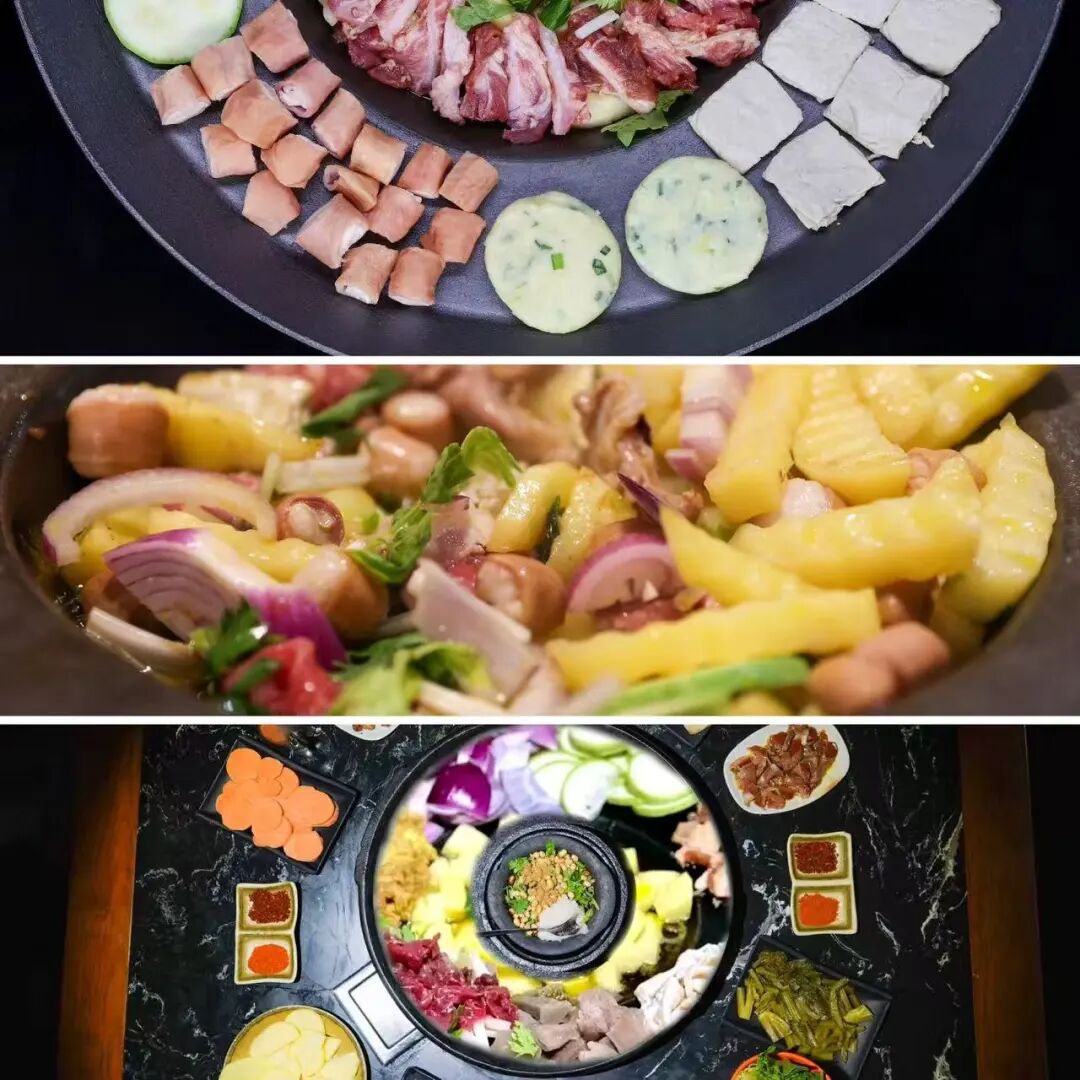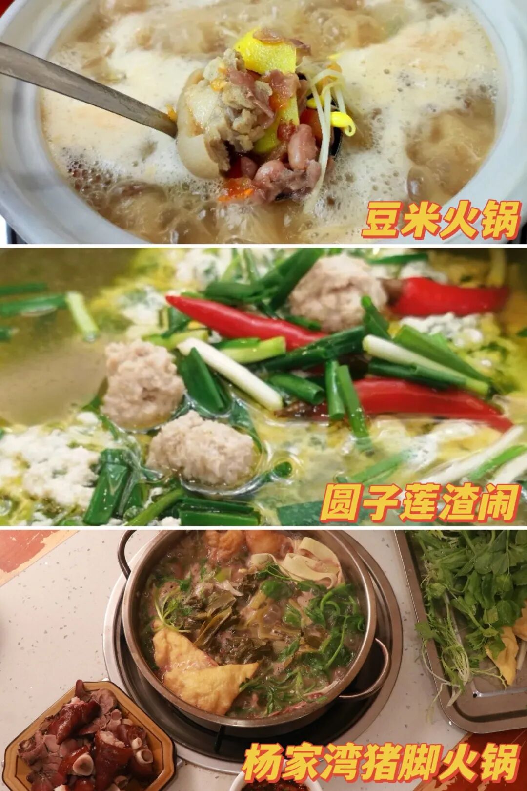 豆米火锅和圆子莲渣闹锅气十足、清爽解腻,非常下饭。杨家湾猪脚火锅是清淡口味爱好者的首选,烟熏腊猪脚腊香浓郁、软糯入味,搭配酸菜、西红柿,鲜香更甚。