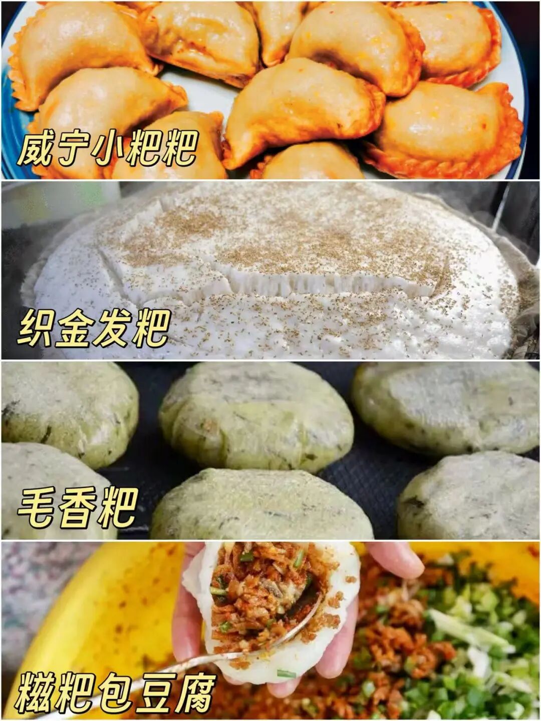 毕节还有各种“粑粑”:威宁小粑粑用荞麦、火腿、豆腐、腌菜等制作,酥香焦脆,咬一口爆汁咸香;织金发粑甘甜清香;毛香粑在清明节前后常见,口感清新、余味绵长;糍粑包豆腐里有炒制的大头菜、肉末、折耳根等,堪称包了糍粑外壳的“大菜”。
