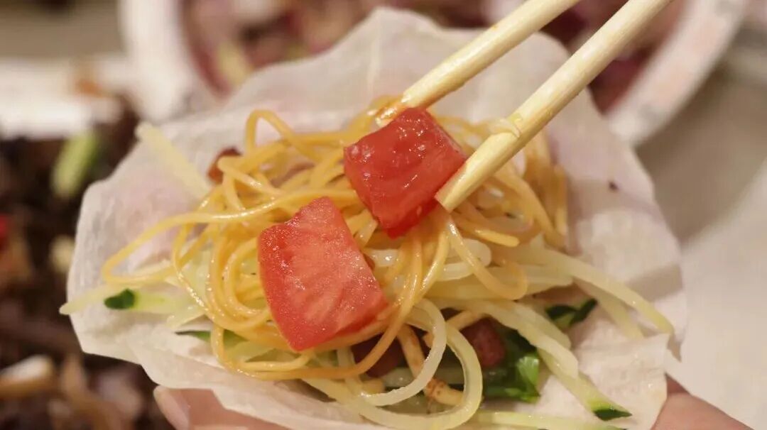 最后,小吃界“王者”丝娃娃也不能落下,配菜丰富,用面皮裹上小菜,灌入酸汤料汁一口吃下,十分惬意。