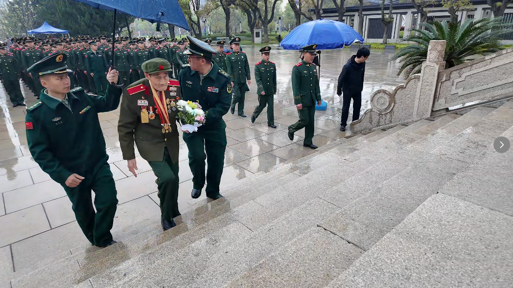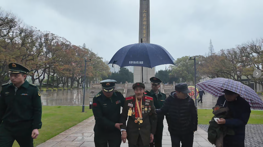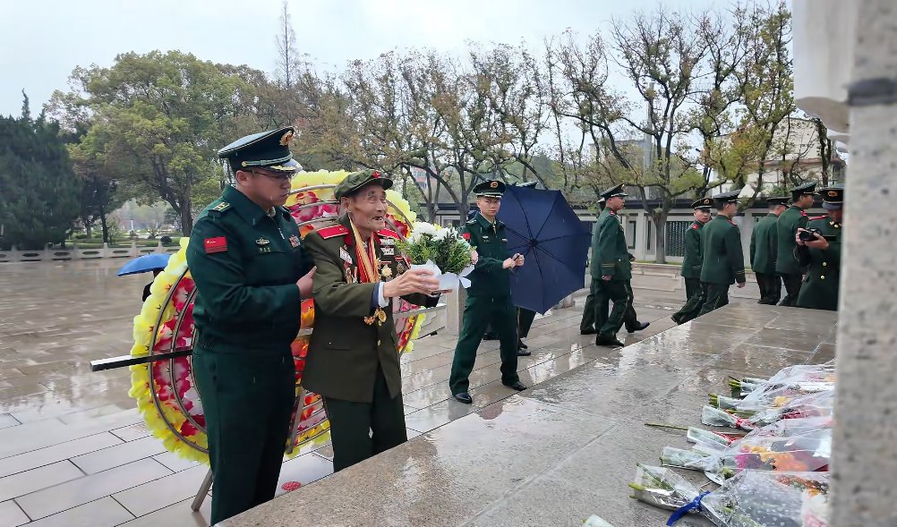 ——孟老在家人搀扶下静静停下脚步,目光久久停留在纪念塔上。得知官兵们正在祭扫,他轻声说出了这个心愿。