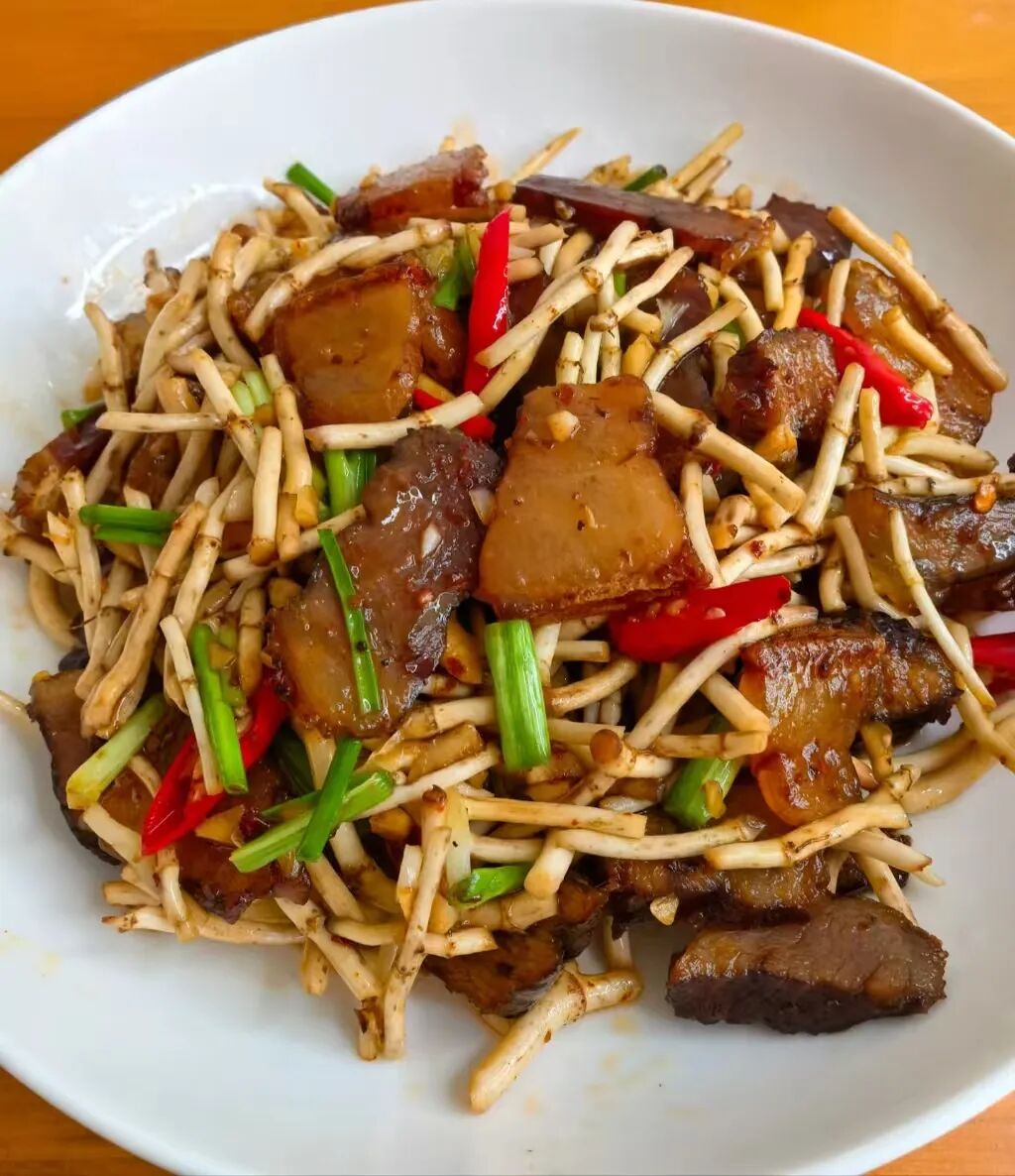 凉拌蕨菜、蕨菜炒腊肉各有风味,最常见的是与腊肉同炒,蕨菜吸足腊肉油脂,口感滑润、清香味足,仿佛把整座山的春意吃进嘴里。