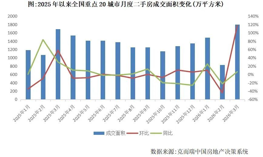 其中成都表现突出,3月二手房成交261万方,居全国首位,同比增加21%;上海、武汉、北京、天津、合肥等城市的成交面积也突破100万方。即便在楼市下行背景下,二手房成交量仍高于2025年,尤其是今年3月,在无重大救市政策的情况下,仅靠市场自然力量,成交量仍超过去年同期,这无疑是积极信号。