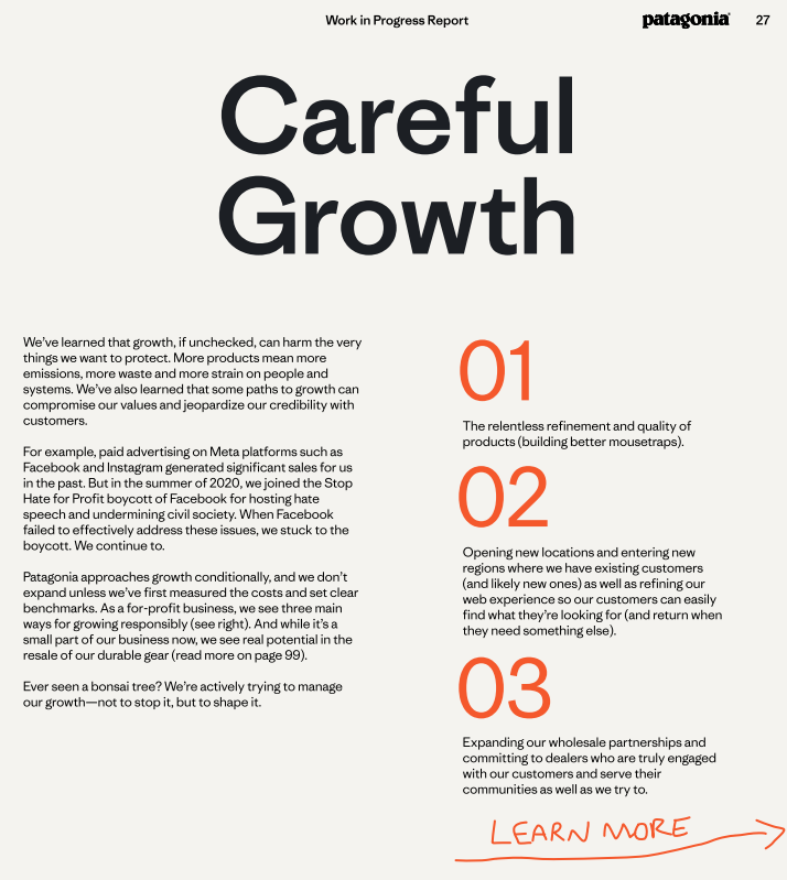 从更广的层面来看,Patagonia对所有市场都采用“Careful Growth(谨慎增长)”的策略。在年度工作进展报告中,Patagonia这样写道:“若任其发展,增长可能会损害到我们原本希望保护的那些事物。产品数量的增加意味着排放量的增多、废弃物的增加,这些都会对人类和系统造成更大压力。我们还了解到,某些促进增长的途径可能会损害我们的价值观。”