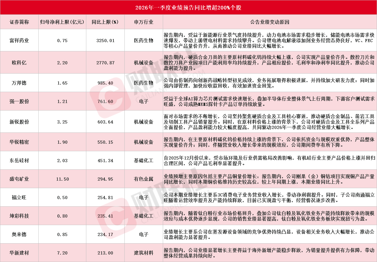 据财联社不完全统计,截至当前,已有36家A股上市公司披露2026年一季度业绩预告。在这些公司中,12只个股的净利润同比预增上限超过200%,它们分别是富祥药业、欧科亿、万邦德、强一股份、新锐股份、华锐精密、东岳硅材、盛屯矿业、福立旺、坤彩科技、奥来德、华新建材(具体情况可参考下图)。此外,德明利、博汇股份、维尔利等公司预计一季度将实现扭亏为盈。