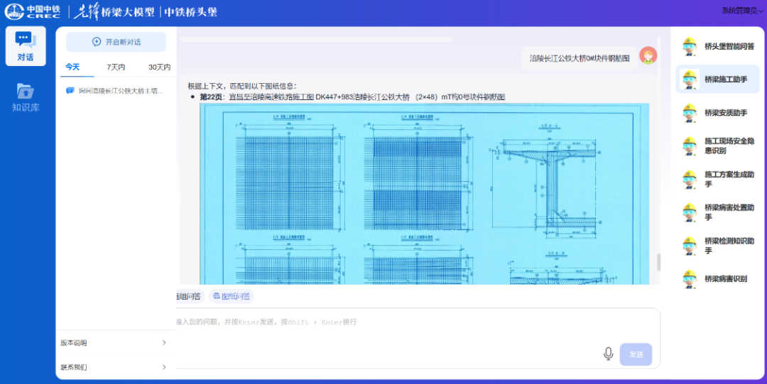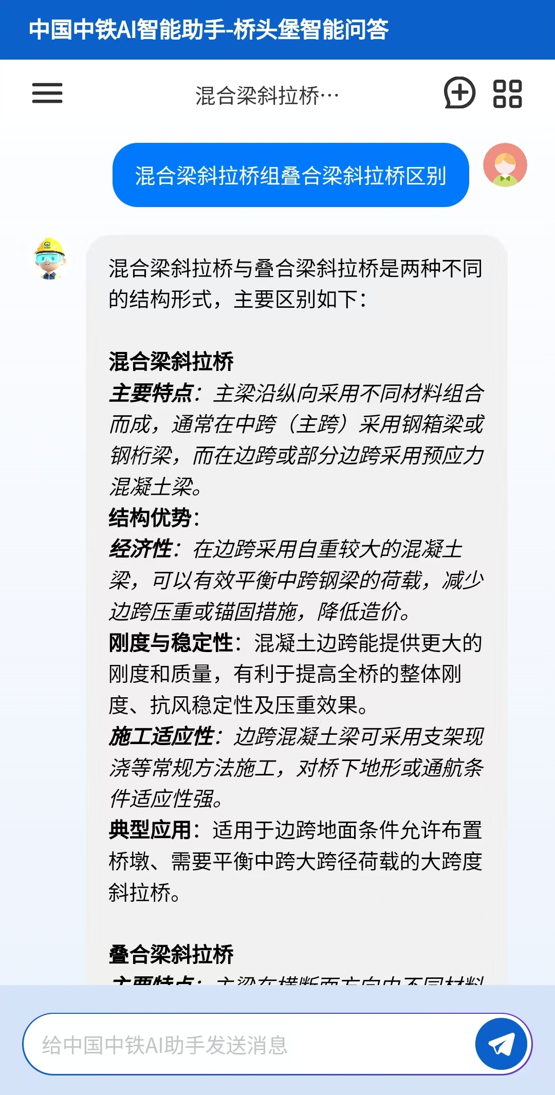 施工中,桥头堡AI智能问答打破传统桥梁信息查询限制,集图纸检索、规范查询、管理文件查阅、业主要求等功能于一体,实现一站式答疑。通过自然语言交互,无论管理人员还是一线工人,日常提问就能快速获得精准答案,同步呈现对应的规范、标准、文件及工艺要点,起到“施工顾问”作用,提升项目管理效能。